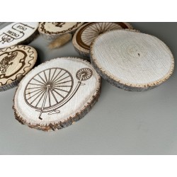 Set of 6 Natural Wood Coasters with Tree Bark, lovingly designed for those passionate about cycling. Each coaster boasts a unique biking-themed engraving, capturing the essence of both rugged mountain rides and smooth urban journeys. Crafted from natural wooden disks and finished with a rustic touch, these coasters serve as both practical table protectors and striking decor pieces. Who would love this? Perfect for cyclists, outdoor adventurers, or anyone who appreciates the beauty of handcrafted woodwork. These coasters make a thoughtful gift for friends and family who delight in biking and cycling. Ideal for Celebrations: These coasters are a fantastic choice for housewarming gifts, birthdays, or as a special surprise for cycling clubs and event souvenirs. They're also a unique way to commemorate anniversaries for those who share a passion for biking. Father‘s day, Mother‘s day gift idea. Why Choose Our Coasters? Each set provides a durable, absorbent place to rest beverages, protecting surfaces while adding a touch of elegance to any coffee table or desk. Embrace the joy of cycling with every sip—our wooden coasters are a practical and stylish addition to any home. Dimensions: Diameter ⌀ - 8cm - 10cm Number of coasters: 6 Material: Natural wooden disks with bark