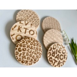 Set of 6 Wooden Coasters with Letter Pattern These coasters are perfect for anyone who appreciates personalized decor and stylish functionality. Each coaster features a distinct letter pattern, adding a unique and elegant touch to your home. **Who would love this?** Ideal for anyone who loves personalized items or enjoys adding a touch of character to their home decor. These coasters make a perfect gift for friends and family, especially those who appreciate unique and customized pieces. **Ideal for Celebrations:** These coasters are an excellent choice for housewarming gifts, birthdays, or as unique surprises for special occasions. They also serve as a thoughtful gift for anniversaries, Mother’s Day, Father’s Day, or any event that calls for a personalized touch. **Perfect 5th Anniversary Gift:** Wood symbolizes strength and stability, making these wooden coasters an ideal 5th anniversary gift. Celebrate your special milestone with a gift that is both functional and meaningful. **Gift for Teachers and Retirees:** Show appreciation for a dedicated teacher or someone retiring from the educational system with these elegant coasters. They make a thoughtful and practical gift, acknowledging their years of hard work and commitment. **Why Choose Our Coasters?** Each set provides a durable, absorbent surface for resting beverages, safeguarding your furniture while adding a touch of elegance to any room. The natural wooden disks with a rustic finish are not only functional but also beautiful decorative pieces. **Dimensions:** - Diameter ⌀: 10cm - Number of coasters: 6 - Material: Natural wooden disks Enhance your next gathering with our charming letter-patterned wooden coasters, bringing a personalized and stylish element to your daily life.